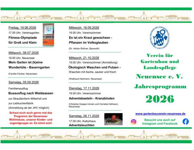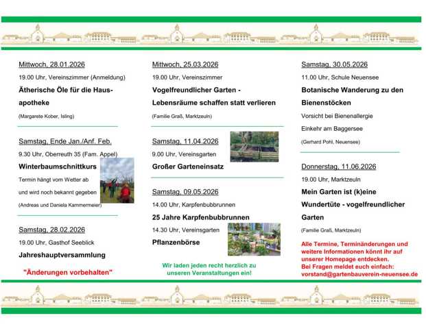 Wir halten alle unsere Mitgliedern mit regelmäßigen E-Mails mit vielen Tipps, Tricks rund um den Garten und den Terminen im Verein auf dem Laufenden. Solltet ihr diese nicht bekommen oder eure E-Mail noch nicht angegeben haben, sendet uns eine Info an Vorstand@gartenbauverein-neuensee.de.
