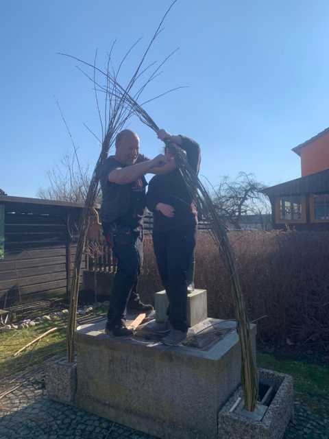 Garten von Christine, um Weiden zu schneiden und daraus einen Bogen für den Brunnen